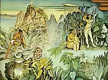 The Mexican painter and muralist Gerardo Murillo, better known as Dr. Atl, was among the best-known guests. Dr. Atl would hold marathon conversations from three to four in the afternoon in the dining room with other visitors such as Mario Orozco Rivera and Benito Messeguer.[12] A fragment of Dr. Atl's mural, Architectural view of the City of Puebla, is preserved in the Chapultepec Castle.[22] Leonora Carrington lived in the casino while they built her house in Cuernavaca.