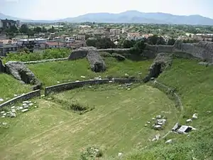 The Roman town lay at the foot of the mountain, close to the Via Latina. The amphitheatre, erected by Ummidia Quadratilla (whose passion for actors is mentioned by Pliny, Epist. vii.24, on the occasion of her death at the age of about eighty), still exists: it is built of opus reticulatum and the five entrances are by arches of larger blocks of stone; it is approximately circular in plan. The external walls are 59 feet high. The seats in the interior have disappeared.[7]