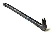 A cat's paw or cat's claw is a metal hand tool used for extracting nails, typically from wood, using leverage. A standard tool in carpentry, it has a sharp V-shaped tip on one or both ends, which is driven into the wood by a hammer to capture the nailhead. Essentially, it is a smaller, more ergonomic, purpose-designed crowbar.