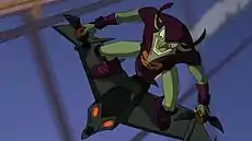 Green Goblin executes an attack on Spider-Man. In keeping with the show's color scheme, Green Goblin's costume emphasized the color green to coincide with negative aspects in Peter's life. A lot of its design was based on original designs from the 1960s and 70s.