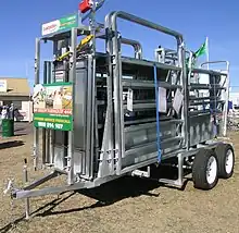 Cattle chutes may be portable,[3] or may be a permanent fixture with a concrete walkway. There are manual and hydraulic options. Portable chutes may be made of steel, iron or aluminum; but modern permanent ones are usually of steel or iron (sometimes timber or even concrete) which is usually set in concrete, with solid or railed sides and a non-slip floor.[4] Anti-bruise chutes do not have sharp edges, and instead use pipe with rounded edges such as oval rails; alternatively sides with sheet iron or steel can be found or built onto the chutes, which improves livestock movement and also prevents injuries from animals getting their legs or heads caught between the rails. Cattle chutes that have concrete floors have the flooring made wider than the race itself to prevent hooves catching between the bottom rail and the edge of the concrete. The concrete is also not smooth like that on city sidewalks but roughed out to give the animals more traction to prevent slipping and injury. Lower parts of the chute have removable side panels for access points and in the event of an animal becoming cast (stuck after falling down) or caught up in which the animal is needed to be freed to prevent injury. Some cattle chutes also have veterinarian access, allowing safe inspection for the veterinarian.