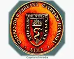 The logo of Cayetano Heredia is a yellow shield with the words "Spiritus ubi vult spirat" from the Gospel of John on the sides. In the center is the Rod of Asclepius, which is representative of medicine and healing.[7]
