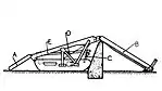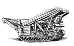Clarke's machine would use a hydraulic ram to insert cylinders of ammonal explosive about 6 feet (1.8 m) underground.[28] After detonation, the machine would advance into the crater it had just created and repeat the process.[28] The machine would be protected by 6 inches (150 mm) of armoured plate at the front to protect it from its own explosions and similarly at the top and rear as a defence against enemy fire.[28] In one record, Clarke mentions "I envisaged a machine that would by hydraulic means more or less row itself through the ground."[28] The machine's trench would be about 6 by 4 feet (1.8 by 1.2 m).[28][lower-alpha 3]
