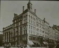 The idea for Central Music Hall was conceived by George B. Carpenter, a local promoter of concerts and lectures.[1] Carpenter was a member of Reverend David Swing's popular nondenominational Central Church, and he imagined a building to be named in its honor that would provide a home for the church and also feature a concert hall, stores, and offices.[1] Construction began in the Spring of 1879 and the auditorium (not yet fully complete) opened on December 5, immediately becoming the city's premier auditorium.[1] It was the first significant music hall to be built following the Great Chicago Fire of 1871.[2] The mixed-use building included a theater, six stories of office space and street-level storefronts.[3]