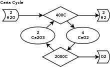 The cerium(IV) oxide–cerium(III) oxide cycle or CeO2/Ce2O3 cycle is a two-step thermochemical process that employs cerium(IV) oxide and cerium(III) oxide for hydrogen production.[1] The cerium-based cycle allows the separation of H2 and O2 in two steps, making high-temperature gas separation redundant.