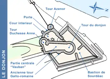 Located in the north-east angle of the enclosure, the keep is actually the former citadel of the medieval closed-town and the heart of the medieval defensive system, forming a small castle on its own isolated from the rest of the site. In origin it was made up of three main towers linked by curtain walls - to the south, the tour Duchesse Anne, to the north the tour du Donjon, to the west the tour Azénor. The main entrance was from the west, formed of a crenelated gate and a drawbridge across the moat separating the citadel from the rest of the castle-town. This collection of works formed a polygonal courtyard, at 2.2m below present ground level, housing a well, oubliettes and several underground rooms.