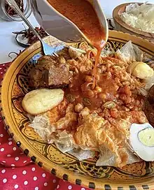 Chakhchoukha or chekhechoukha (Arabic: شخشوخة) is a traditional Algerian dish made from torn or rolled pieces of cooked semolina dough that are served in a flavorful tomato-based sauce. The dish consists of small pieces of rougag (thin round flatbread) mixed with marqa, a tomato stew.[1] The dish is typically made by boiling the semolina dough in salted water until it is cooked and then rolling it into small balls or tearing it into bite-sized pieces.