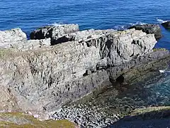 Ediacaran–Cambrian boundary section at Fortune Head, Newfoundland, in the Chapel Island Formation. The darker units constituting the bottom 2–3 m of the outcrop correspond to Unit 1; the GSSP lies a couple of meters into Unit 2.