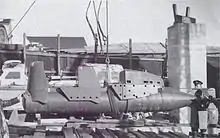 Official development of the Chariot began in April 1942, primarily led by two officers of the Royal Navy's submarine service: Commander Geoffrey Sladen DSO*, DSC and Lieutenant Commander William Fell.[2][3] Training of crews was based out of the depot ship HMS Titania initially stationed at Gosport and later in Scotland at Loch Erisort (known as port "HZD"), Loch a' Choire (known as port "HHX") and Loch Cairnbawn (known as port "HHZ")[4] and out of HMS Bonaventure in the same region.[5]