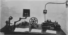 Apgar's equipment was mostly homemade with the exception of the headphones and of an improved Audion designed by Edwin Howard Armstrong that was part of the circuit used to detect and amplify the signal.[20] It was connected to a Dictaphone which allowed him to record Morse code transmissions on wax cylinders made by Edison Manufacturing Company.[21] His first recording was made October 12, 1913, of the New York Herald station, which by this time was using the call sign WHB.[lower-alpha 2] By October 1914, he had recorded other transmissions including the United States Navy station NAA sending time signals.[14]