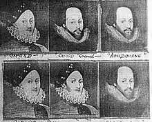 In his later years his personal hobby was the accumulation of evidence to prove that his ancestor Edward de Vere, 17th Earl of Oxford, was the true author of Shakespeare's plays, an idea first suggested in 1920 by J. Thomas Looney. He was the first person to propose that de Vere was the subject of the Ashbourne portrait, an idea he passed to Looney's follower Percy Allen.[7] According to Allen, Beauclerk created composite images by merging the established Welbeck portrait of de Vere with various known and alleged portraits of Shakespeare. In addition to the Ashbourne portrait, Beauclerk applied his method to the Grafton, Felton and Droeshout portraits. Allen believed that Beauclerk's method "shows them all to be portraits of the same man - Edward de Vere".[7]