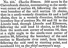 Simeon chose 500 acres (2.0 km2) of land and had frontages with the road leading to the Ōpāwaho / Heathcote River and the road leading from Christchurch to Halswell. The land was numbered in the order of it having been chosen, and his land was thus known as Rural Section 154.[29] He also owned town properties in Armagh, Gloucester, Manchester and Madras Streets.[30]