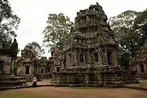 Chau Say Tevoda is a temple at Angkor, Cambodia just to the northeast of the ancient capital Angkor Thom's east gate, directly south of Thommanon across the Victory Way (it pre-dates the former and post-dates the latter).[1]: 119 [2][3] It is on a road which has the Thomannon temple on its opposite side, 500 metres (1,600 ft) from the east gate and 200 metres (660 ft) to a bridge built with carved stones from temple ruins in the vicinity. The bridge is without a river flowing beneath it in view of the shifting nature of the course of the Siem Reap River.[4]