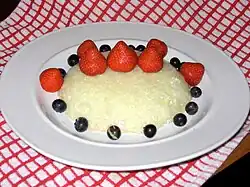 A cheese pudding garnished with strawberries and blueberries