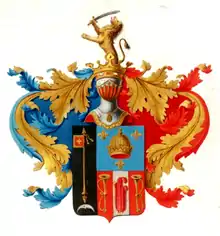 The shield is divided perpendicularly into two parts, of which in the right in the black field is the Banner having the Golden shaft, placed on the silver Crescent; the left part is cut horizontally by a line. In the upper part in the blue field is depicted the Cardinal Golden Hat and three golden Lilies near it. In the lower part in the red box are two golden Trumpets and between them on the silver strip are three ostrich Feathers of red color. The shield is crowned with an ordinary noble helmet with a noble crown on it, on the surface of which a lion with a sword is visible. The mantling on the shield is gold, blue and red.