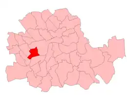 In 1885, the existing parliamentary borough was divided into five single-member constituencies. The Redistribution of Seats Act 1885 defined the redrawn Chelsea seat as comprising the parish of St Luke, Chelsea. The constituency had a detached outlier, the Kensal Green area, because of its history as a detached part of St Luke parish.[4] (The remaining parishes became the constituencies of Fulham, Hammersmith, Kensington North and Kensington South.)