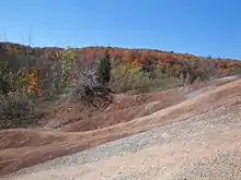 The Cheltenham Badlands are in Caledon, Ontario, on the southeast side of Olde Base Line Road, between Creditview and Chinguacousy Roads. The site occupies an area of approximately 0.4 square kilometers and features exposed and highly eroded Queenston shale.[1] The Cheltenham Badlands are a significant educational site due to the readily visible geologic processes and the red colour and the unique topography of the exposed shale make this a popular tourist site.[2][3] The site is a Provincial Earth Sciences Area of Natural and Scientific Interest (ANSI) since it is considered one of the best examples of "badlands topography" in Ontario.[4][5]