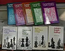 Yuri Averbakh published a monumental set of books in Russian in 1956. The works were first published in English as several individual books (Pawn Endings, Bishop Endings, Knight Endings, Bishop v. Knight Endings, Rook Endings, Queen and Pawn Endings, Queen v. Rook/Minor Piece Endings, Rook v. Minor Piece Endings) and later collected into the five-volume Comprehensive Chess Endings. It was also published in other languages.[30] Bobby Fischer had these books sent to him during his World Championship match.[31] World Champion Max Euwe published the comprehensive eight-volume Das Endspiel in 1957.[32]