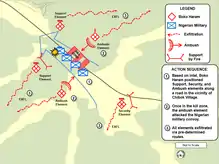 Several Boko Haram fighters hid on either side of the road, while others formed support and security units; the former were supposed to aid the attack on the Nigerian Army convoy, while the latter ensured that the ambushing fighters were not surprised by possible government reinforcements. The insurgents waited until the military convoy had entered the kill zone, whereupon they launched their assault. Several soldiers were killed or wounded until the Nigerian Army troops managed to break through. The insurgents then retreated via planned routes, while the convoy continued to travel to Maiduguri.[3] The Nigerian military initially claimed that only four soldiers had been killed, but independent sources confirmed that 12 had been killed and numerous others wounded.[2] One of the dead was a commanding officer, Major Olalekan Akintola.[1] According to the government, several attackers had also been killed during the fighting.[13]