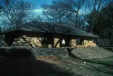 Travertine district, embracing the old Platt National Park, is like a large city park, three miles long and less than one mile wide. A narrow road circles the district, passing by parking areas, camp and picnic grounds, the Travertine Nature Center, swimming holes, and springs. A bison pasture was constructed by the Civilian Conservation Corps in the 1930s.[12][13] Travertine Creek, joined by Rock Creek, flows through the district, rising in Antelope Springs and Buffalo Springs at the eastern end of the park. The springs produce 5 million gallons per day (20 million liters) of cool, crystal clear-water and form Travertine Creek which is joined by Rock Creek about 2 miles from its source. A number of other fresh water and mineral springs contribute to Travertine and Rock Creek as they flow through Travertine District, dropping in small waterfalls over several ledges. Several miles of walking and biking trails wind through the heavily forested creek bottomland. Very popular and often crowded in summer, the Travertine district has been described as an oasis in the Oklahoma prairie.[14]