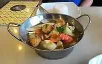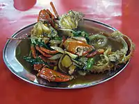 Chinese culinary culture is particularly evident in Indonesian cuisine through the Hokkien, Hakka, and Cantonese loanwords used for various dishes.[2] Words beginning with bak () signify the presence of meat, e.g. bakpau ("meat bun"); words ending with cai () signify vegetables, e.g. pecai ("Chinese white cabbage") and cap cai ("mixed vegetables").[3] Also mi or mie () signify noodle as in mie goreng ("fried noodle").