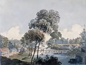 King's Bridge, constructed about 1790, was the very first bridge over the Welland River. It was located at the mouth of the river, closer to the Niagara than today's bridge. Sketches by Lady Simcoe (wife of Lieutenant Governor John Graves Simcoe) and deputy postmaster George Heriot each show a bridge consisting of pilings driven into the river with a wooden deck.
