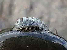 The valves and girdle are generally uniform in a green colour, but individuals brown, buff and even light blue have been known to be found, especially in the North of New Zealand. This is sometimes combined with individuals who lighter chevron or zig zag markings.[2] Underneath the body of the chiton, there is a large foot which spans its total length.[4] This is used to keep suction onto the chosen substrate. Gills are not obvious, instead being found in a set on either side of the foot.[4] It has a small mouth at one end of the foot, however the mouth is merely a simple cavity.[4]