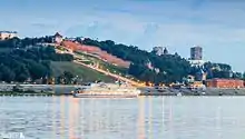 The Chkalov Stairs is a monumental flight of steps in the center of Nizhny Novgorod, connecting Minin and Pozharsky Square, the Upper Volga and the Lower Volga embankments. It was built by the architects Alexander Yakovlev, Lev Rudnev and Vladimir Munts.[1] It is the longest staircase in Russia.[2][3] The staircase starts from the monument to Chkalov, near the St. George's Tower of the Kremlin. It is built in the form of a figure of eight and consists of 560 steps, if you count it both sides. The number of steps from the bottom to the top is 442 on the right. In the intersections of the side slopes there are two observation platforms. At the bottom of the stairs is a monument to the boat "Hero", which is located at the Lower-Volga embankment.