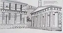 The Choragic Monument of Nikias is a memorial building built on the Acropolis of Athens in 320–319 BCE to commemorate the choregos Nikias, son of Nikodemos.[1] It was situated between the Theatre of Dionysos and the Stoa of Eumenes where its foundations remain along with some fragmentary elements of the structure. It was built in the form of a substantial hexastyle Doric temple with a square cella and might have been surmounted with the prize tripod of the Dionysia.[2] The monument was dismantled at some point in late antiquity and the masonry reused in the Beulé Gate.