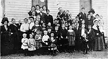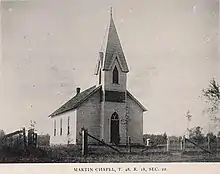 In 1870, St. Martin's Catholic Church, an 18x24 log structure, was built in Chouteau Springs on 1.5 acres of land donated by Daniel Martin, called "Martinsville."[9] A larger frame structure church was built on the same grounds in 1877 and in 1908 a solid red brick church was built on 2.25 acres donated by Anton Joseph Wesselman. The third church was about 1/4 mile north of the Chouteau Springs KATY railroad station. In 1920 St. Martin's Parochial School was built next to the brick church.[10] One hundred years after the first church was built in 1870, the Diocese closed down St. Martin's Church and School in 1970. St. Martin's Cemetery (Chouteau Springs "Martinsville") is located on the eastern rim of Chouteau Springs 38°55′01″N 92°52′40″W / 38.9169006°N 92.8778000°W. Cemetery records are regularly surveyed.[11]