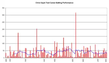 An innings-by-innings breakdown of Gayle's Test match batting career up until 2008, showing runs scored (red bars) and the average of the last ten innings (blue line).