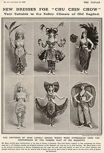 The success of the "Arabian Nights" adaptation Kismet, a 1911 play by Edward Knoblock, inspired Oscar Asche to write and produce Chu Chin Chow. Asche directed the musical and played the lead role of Abu Hasan, leader of the forty thieves (the "Chu Chin Chow" of the title refers to the robber chief when impersonating one of his victims). Besides Asche, the production starred his wife, Lily Brayton, and the former D'Oyly Carte Opera Company star Courtice Pounds. Costumes were by the designer Percy Anderson.[7]