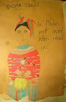 Chuj [tʃux] is a Mayan language spoken by around 40,000 members of the Chuj people in Guatemala and around 3,000 members in Mexico. Chuj is a member of the Qʼanjobʼalan branch along with the languages of Tojolabʼal, Qʼanjobʼal, Akateko, Poptiʼ, and Mochoʼ which, together with the Chʼolan branch, Chuj forms the Western branch of the Mayan family. The Chujean branch emerged approximately 2,000 years ago.[3] In Guatemala, Chuj speakers mainly reside in the municipalities of San Mateo Ixtatán, San Sebastián Coatán and Nentón in the Huehuetenango Department. Some communities in Barillas and Ixcán also speak Chuj. The two main dialects of Chuj are the San Mateo Ixtatán dialect and the San Sebastián Coatán dialect.[4]