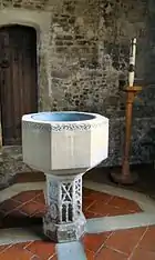 The tower arch and five doorways in the church date to about 1300 AD but the remainder of the building is from the Perpendicular Period with the chancel dating to about 1470. In the floor of the chancel are the remains of a monumental brass of 1481 to Archdeacon John Rudying who is said to have rebuilt or refurnished the chancel.[3] There is a Latin inscription between Rudying and the Figure of Death who is about to strike him with a spear.[4][5] It is the same memorial that was said to have been destroyed during the restoration of St Andrew's Church in 1870. This is described as lying in a large Purbeck Marble slab in the middle of the chancel being 11½ ft by 5½ ft with the effigy and canopy with Saints John the Baptist, Anna, Elizabeth, and Mary of Egypt being destroyed but other figures of Death and angels and a Latin inscription surviving.[6]