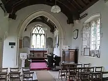On the east wall, on either side of the altar, are stone slabs of about 1800, engraved with the Ten Commandments. There are memorial tablets on the north and south walls of the chancel, to Richard D'Aubeny (rector from 1775 to 1802) and Joseph D'Aubeny, a squire of the parish.[3][5]