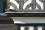 The upper storeys have ornamental panels featuring several different decorative motifs, including roundels and diagonal ogee braces.[3][16] The eaves have corbel brackets with carvings including human faces and animals.[1] These include a lion, ape and devil, as well as a salamander, supposed to give protection against fire.[6][17][18] Gilded carvings of Richard and Margerye Churche are located above the main entrance, on either side.[19] The timbers bear carpenters' marks with both Roman and Arabic numerals, some being unusually long.[20] The highly decorated style is typical of the timber-framed buildings of the Elizabethan period.[16]