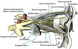 ![]() Detailed view of nerves of lateral orbit showing the ciliary ganglion immediately behind the globe of the eye. | |