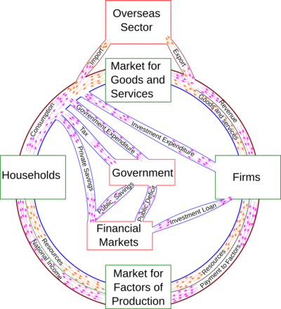 This graph shows the circular flow of income in a five-sector economy. The flow of money is shown with purple, and the flow of goods and services is shown with orange. Money flows in the opposite direction from goods and services.[1]