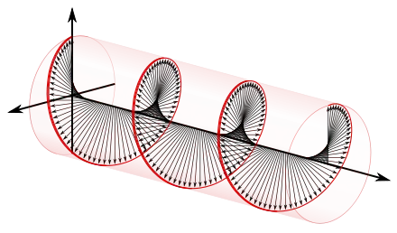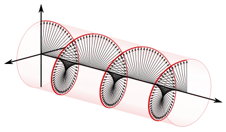 To appreciate how this quadrature phase shift corresponds to an electric field that rotates while maintaining a constant magnitude, imagine a dot traveling clockwise in a circle. Consider how the vertical and horizontal displacements of the dot, relative to the center of the circle, vary sinusoidally in time and are out of phase by one quarter of a cycle. The displacements are said to be out of phase by one quarter of a cycle because the horizontal maximum displacement (toward the left) is reached one quarter of a cycle before the vertical maximum displacement is reached. Now referring again to the illustration, imagine the center of the circle just described, traveling along the axis from the front to the back. The circling dot will trace out a helix with the displacement toward our viewing left, leading the vertical displacement. Just as the horizontal and vertical displacements of the rotating dot are out of phase by one quarter of a cycle in time, the magnitude of the horizontal and vertical components of the electric field are out of phase by one quarter of a wavelength.