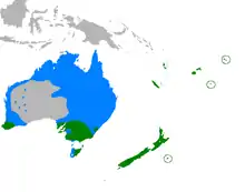 The swamp harrier is widespread through Australasia and many islands in the south-west Pacific region, including much of Australia (except the arid region), New Zealand (where it is common in open country),[5] Fiji, Vanuatu, New Caledonia and as stragglers on some subantarctic islands.[6] It is usually found in wetlands and well-watered open country.