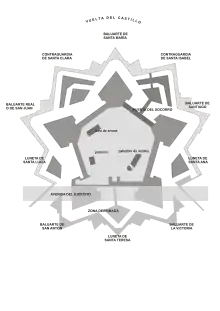 The denominations of the bastions are: San Antón, el Real, Santa María, Santiago and Victoria.