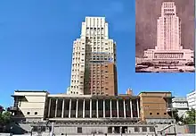 Construction began in 1935 and was inaugurated on July 16, 1941, although the actual building differs from the original 1929 Cravotto model;[4] his main tower measured 114m, which would have become the tallest building in the city, for financial reasons rose to only 78m, remaining in second place after the Palacio Salvo. It also lacked the brick siding. The side wings, the underground concourse, and the garage were built later, giving the building its current appearance. While not the tallest building in Montevideo, its location on 18 de Julio Avenue, built on the crest of a ridge or long hill, makes the building look more impressive. The area of the building had begun development in at least 1867.[5]