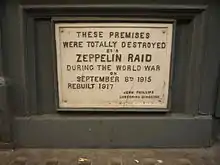 On the night of 8 September 1915, Zeppelin L13 commanded by Kapitänleutnant Heinrich Mathy attacked London, and two of his bombs hit Messrs Frank Stadelman's warehouse at 59–61 Farringdon Road. Falling masonry from the building did considerable damage to the 6th Londons' drill hall behind.[77][78]