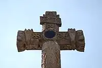Its principal monument is a 16th-century church with a former monastery. It conserves its atrium and original monolithic atrium cross sculpted by indigenous hands. This cross rests on a pyramidical base with a skull and bones. It also contains the coat of arms of the Franciscan order. The pyramidical base and skulls display an indigenous influence, as does the obsidian mirror located on the cross itself which was the symbol of the god Tezcatlipoca (god with the sacrificed foot) who was worshiped by both the Aztecs and the Purépecha.[3] The church contains two notable baptismal fonts. The larger one may have been the basin of a pre-Hispanic public fountain from the 16th century. It is decorated with small angels and stylized lions. There are also letters on the rim of the font, but they do not spell out words. Tradition says they were used to teach literacy. The smaller font is monolithic and contains the image of a small nude angel in Renaissance style but with some medieval aspects.[2][3]