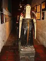 Immediately following Clare's death her heart was removed from her body, and upon inspection it was reported that symbols of Christ's passion, a crucifix and a scourge, were found within her heart.[3][4][5] Other historians report that an "autopsy" was conducted and a small crucifix was found in her heart and three gallstones were found in her gallbladder, which were taken as a symbol of the Holy Trinity.[6] Upon hearing the news of these signs, the vicar of the Bishop of Spoleto traveled to Montefalco "burning with indignation" suspecting that the nuns of the convent had planted the symbols. A commission consisting of physicians, jurists, and theologians was assembled to conduct an investigation, which subsequently "ruled out the possibility of fabrication or artifice".[3] The vicar of the Bishop of Spoleto, who came to Montefalco as an inquisitor eager to punish those responsible for fraud, came to be convinced of the authenticity of the findings after personally verifying that the signs were not the result of trickery.[3] However, doubts as to the veracity of the findings persisted even at the canonization proceedings, which were fraught with conflicts including a challenge from the Franciscans that Clare should not be canonized as a saint of the Order of Saint Augustine because she had been a Franciscan tertiary.[3] During the proceedings Tommaso Boni, a Franciscan from Foligno and formerly chaplain to Clare's community, stated that he suspected that the "symbols in her heart were planted by a nun from Foligno"; furthermore that John Pulicinus, who had been chaplain at the time of Clare's death, had opposed the veneration of the symbols found in her heart.[3][7]