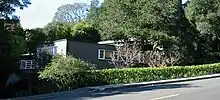 Mayhew designed his own house in collaboration with Serge Chermayeff, associate architect and employee of Mayhew's during 19401941 when Chermayeff was also teaching at California School of Fine Arts. Chermayeff was brought in so that Mayhew would not have his own wife for a client.[8] The house contrasted sharply with existing homes on Hampton Road, and appeared to be made of rectangular shapes descending the sloped property. The house divided into two functional groups, one for adults and one for children, with all living and sleeping rooms facing south. Glass walls were specified to allow maximum sunlight and viewing pleasure.[12] The two main structural units enclosed a private garden and were connected by a broad stairway enclosed against the weather, with the street side made of solid wood and the garden side fully glazed. The three children's rooms were separated with demountable hanging walls that could be changed to adapt to the family's needs. Author Alan Hess wrote in 2007 that the clean abstraction of the rectilinear blocks appeared to be based on Chermayeff's Bauhaus leanings but that the casual, site-specific interaction of garden, house and modernity showed the relaxation of California living apparent in Mayhew's prior work.[8]
