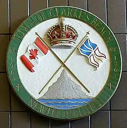 A wood carving of the town seal of Clarke's Beach on display at Memorial University of Newfoundland.