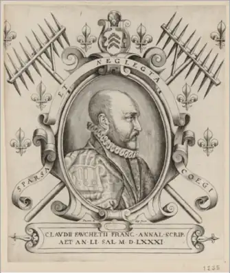 Claude Fauchet (3 July 1530 – January 1602) was a sixteenth-century French historian, antiquary, and pioneering romance philologist.[1] Fauchet published the earliest printed work of literary history in a vernacular language in Europe, the Recueil de l'origine de la langue et poësie françoise (1581).[2][3][4][5] He was a high-ranking official in the governments of Charles IX, Henri III, and Henri IV, serving as the president of the Cour des monnaies.