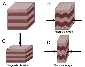 Different ways in which a cleavage can develop in a sedimentary rock. A: original sedimentary rock; B: pencil cleavage; C: diagenetic foliation (parallel to bedding); D: slaty cleavage.