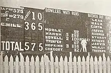 - ↑ See scoring (cricket) for an explanation of cricket score formats. This score and all others in the article follow the Australian format of wickets fallen followed by runs made.